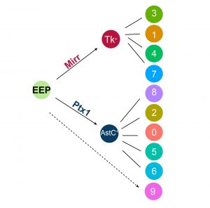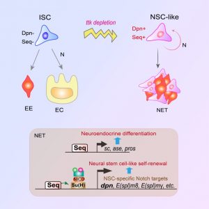 肠内分泌细胞多样性的原理:一个“三位数”的编码机制 三种处于不同层级的转录因子的组合形成了一个“三位数”的编码,此编码指导并决定了果蝇肠内分泌细胞各亚型的身份。分化成熟的肠内分泌细胞仍然具有可塑性,通过改变编码中的一个转录因子的表达,可以实现肠内分泌细胞亚型之间的命运转化。 阅读原文 新闻报道 肠内分泌细胞:小鼠-果蝇 头对头比较 肠内分泌细胞在哺乳动物和和果蝇中均有多种亚型,它们均产生多种神经肽,发挥着多种重要的生理作用。实验室的郭兴庭博士与博士生吕佳盈合作,对小鼠和果蝇的肠内分泌细胞进行了全方位的“头对头”比较:包括肠内分泌细胞的分化的机制、细胞分型、命运决定转录因子、神经肽种类、脑肠轴及已知的生物学功能等。通过比较进一步明确了果蝇的肠内分泌细胞的组成、功能和调控模式等诸多方面的相似性,提示果蝇遗传模型为进一步理解肠内分泌细胞生物学可以发挥重要作用。 阅读原文 view pdf 模式图 肠道干细胞身份的改变导致神经内分泌肿瘤的发生 转录因子Tramtrack的缺失导致果蝇肠上皮干细胞转换成了神经干细胞样细胞,进而导致了神经内分泌肿瘤的发生。该发现提示神经干细胞自我更新程序的异位激活可能是神经内分泌肿瘤的一个潜在致病机制。 阅读原文 新闻报道 肠内分泌细胞多样性的解析 通过单细胞技术结合遗传学分析,果蝇肠内分泌细胞的亚型、分布、决定亚型命运的转录因子及信号调控机制等得到了比较系统性的解析。这些结果提示Notch 信号通路的侧抑制作用及发育过程中建立的体节身份共同决定了肠内分泌细胞的多样性。 阅读原文 查看数据 新闻报道 干细胞的命运抉择:决定就在一瞬间 成体干细胞通常具有多能性,即能够产生多种不同的子细胞,但潜在的命运决定机制尚不清楚。这项研究发现,在果蝇的肠上皮干细胞中,一个转录因子的瞬时表达,决定了干细胞所产生的子细胞类型。 阅读原文 view pdf 模式图